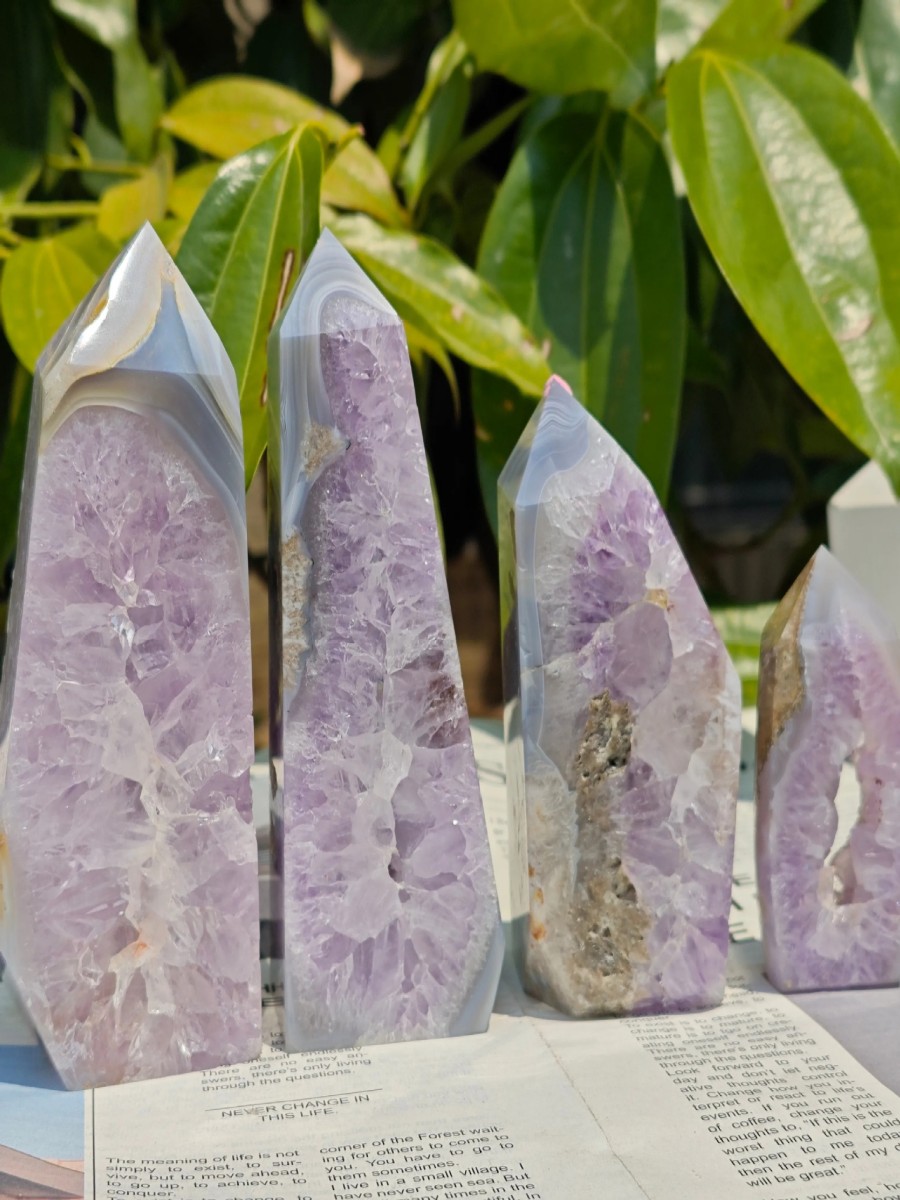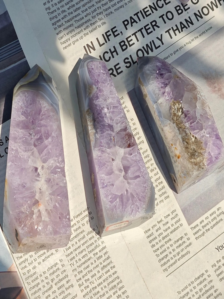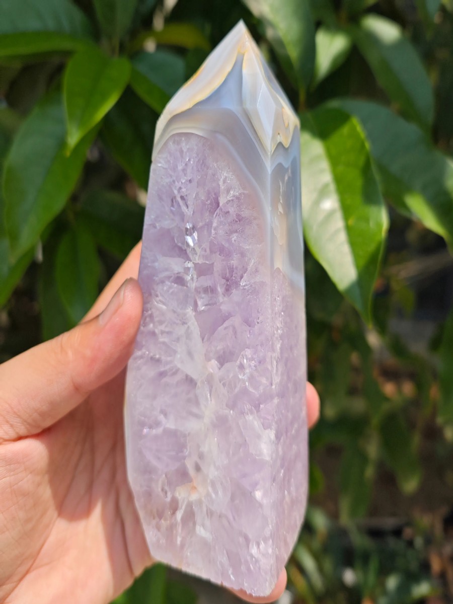 Elevate your space with the ArvnDao Amethyst Agate Geode Tower, a beautifully polished crystal point featuring a natural geode center filled with sparkling amethyst clusters. This unique fusion of amethyst and banded agate creates a powerful harmony of calming, balancing, and spiritually uplifting energy.