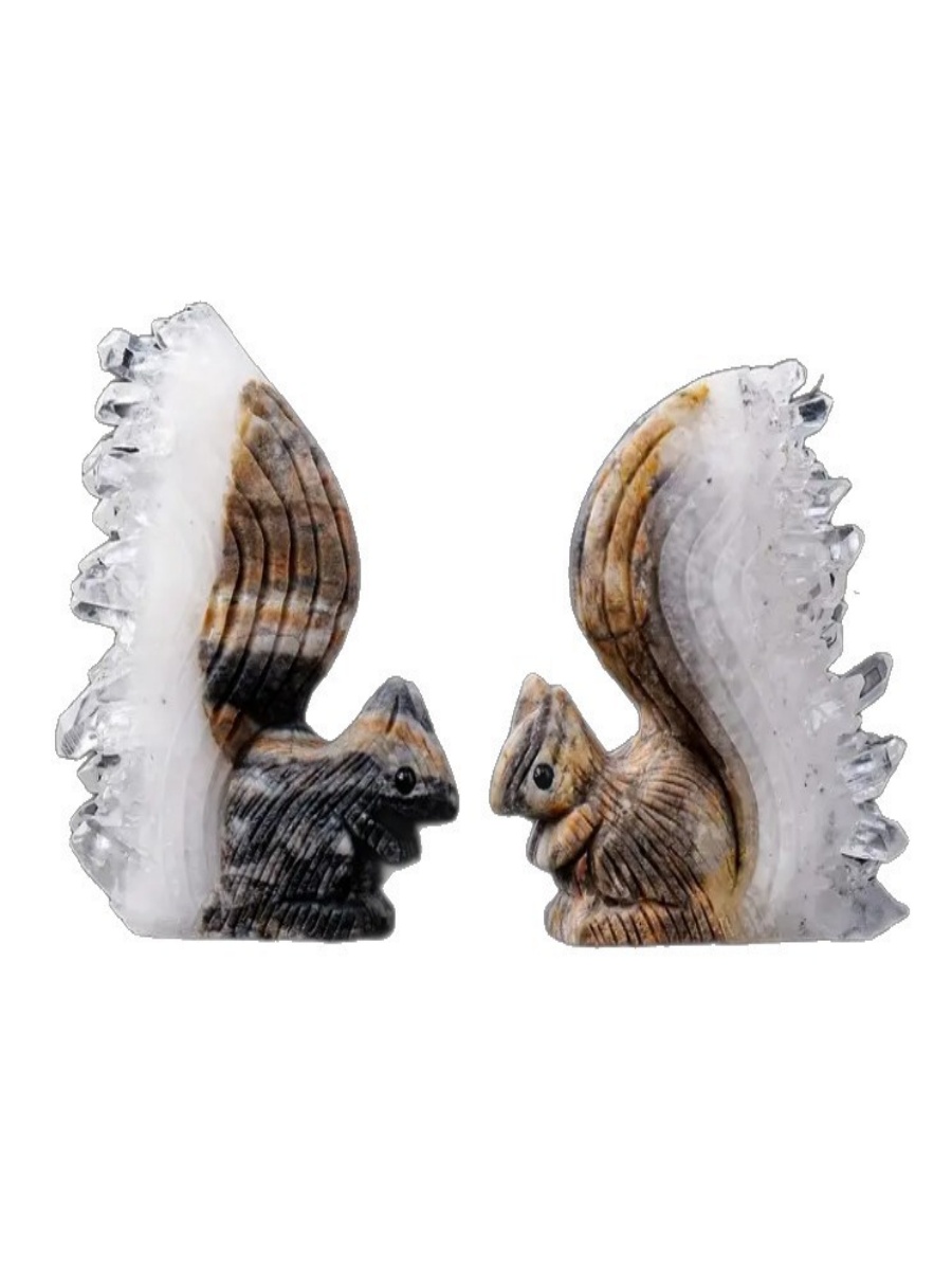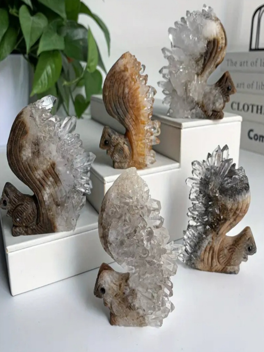 • Hand-carved crystal squirrel with natural quartz cluster tail