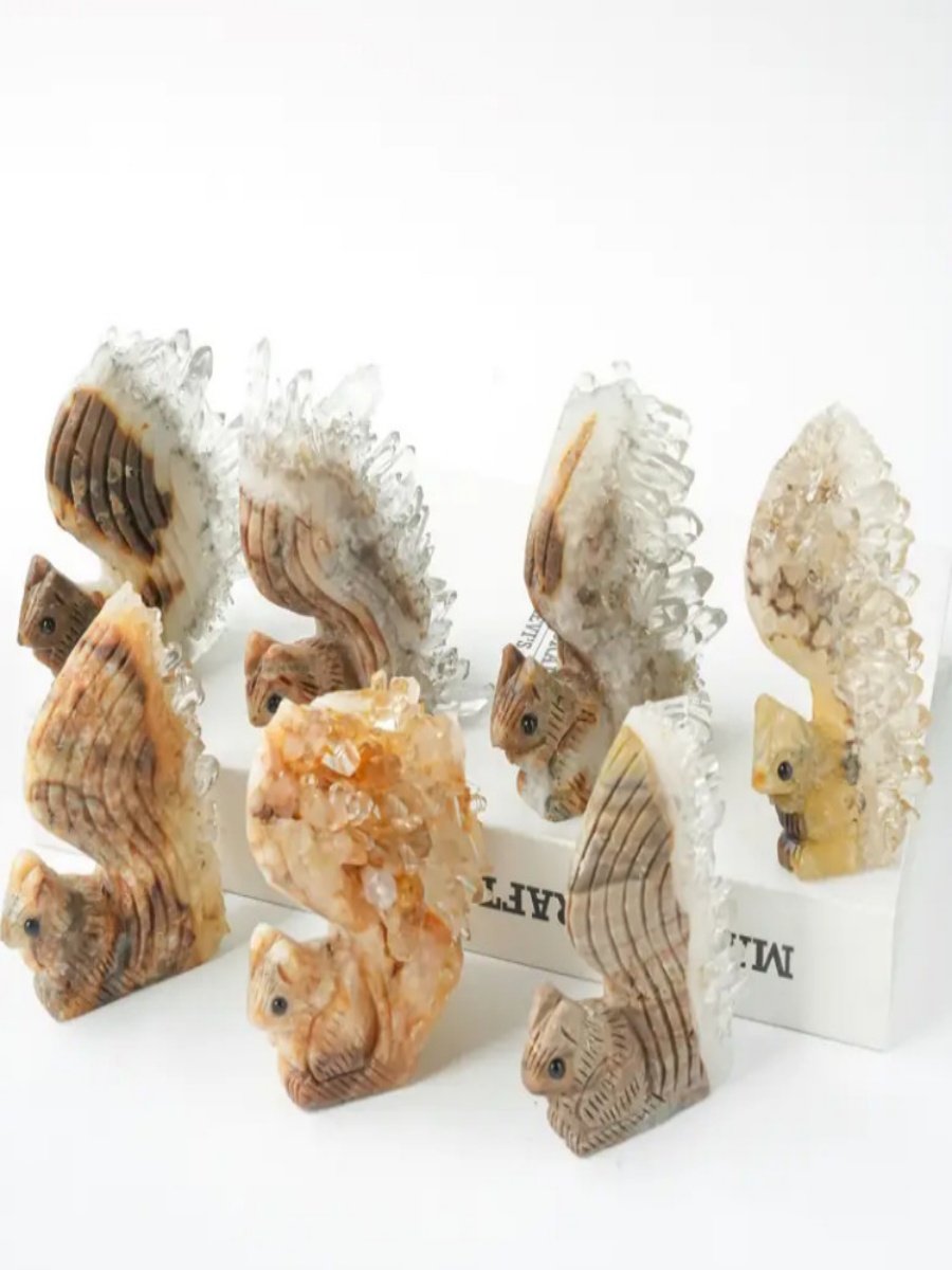 ArvnDao Crystal Squirrel Carving blends flower quartz and raw crystal cluster energy, bringing joy, abundance, and protection to your space.