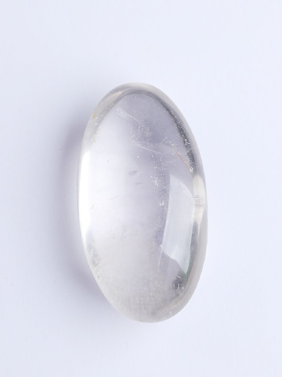 Smooth natural clear quartz palm stone for clarity, purification, and healing energy.