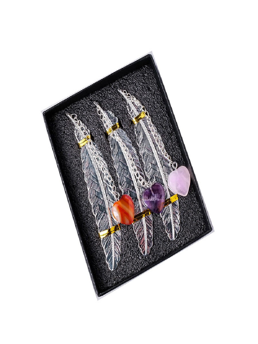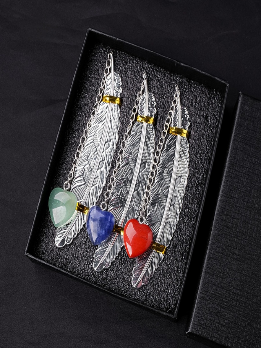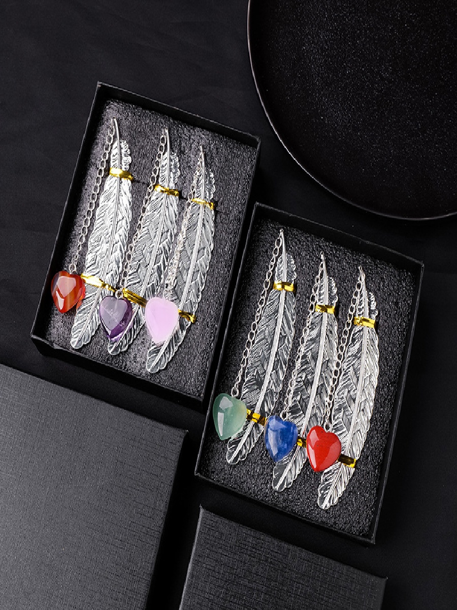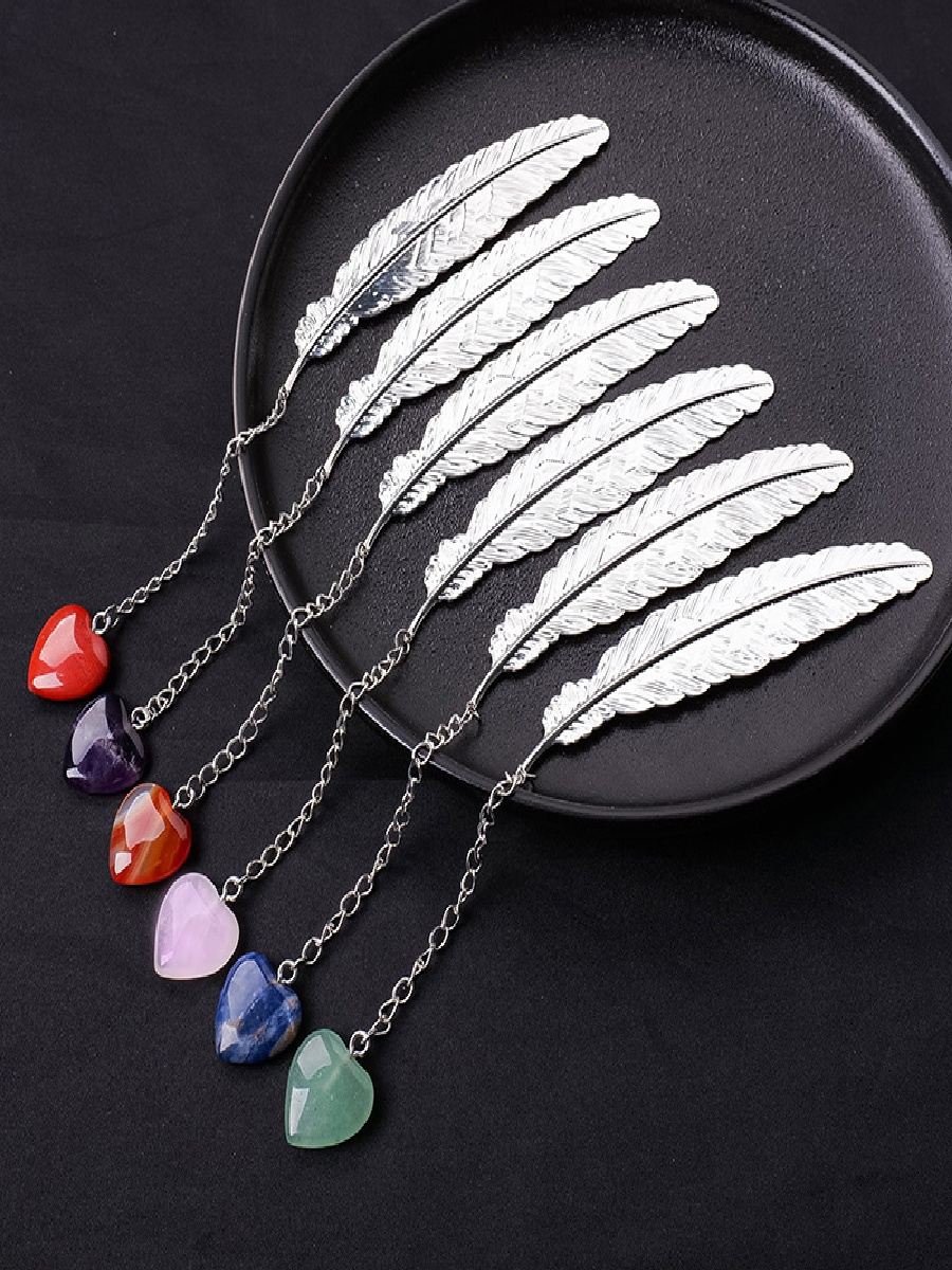 Elevate your reading ritual with the ArvnDao Crystal Heart Bookmark Set, featuring a handcrafted metal feather paired with natural gemstone hearts including Red Agate, Amethyst, and Rose Quartz.