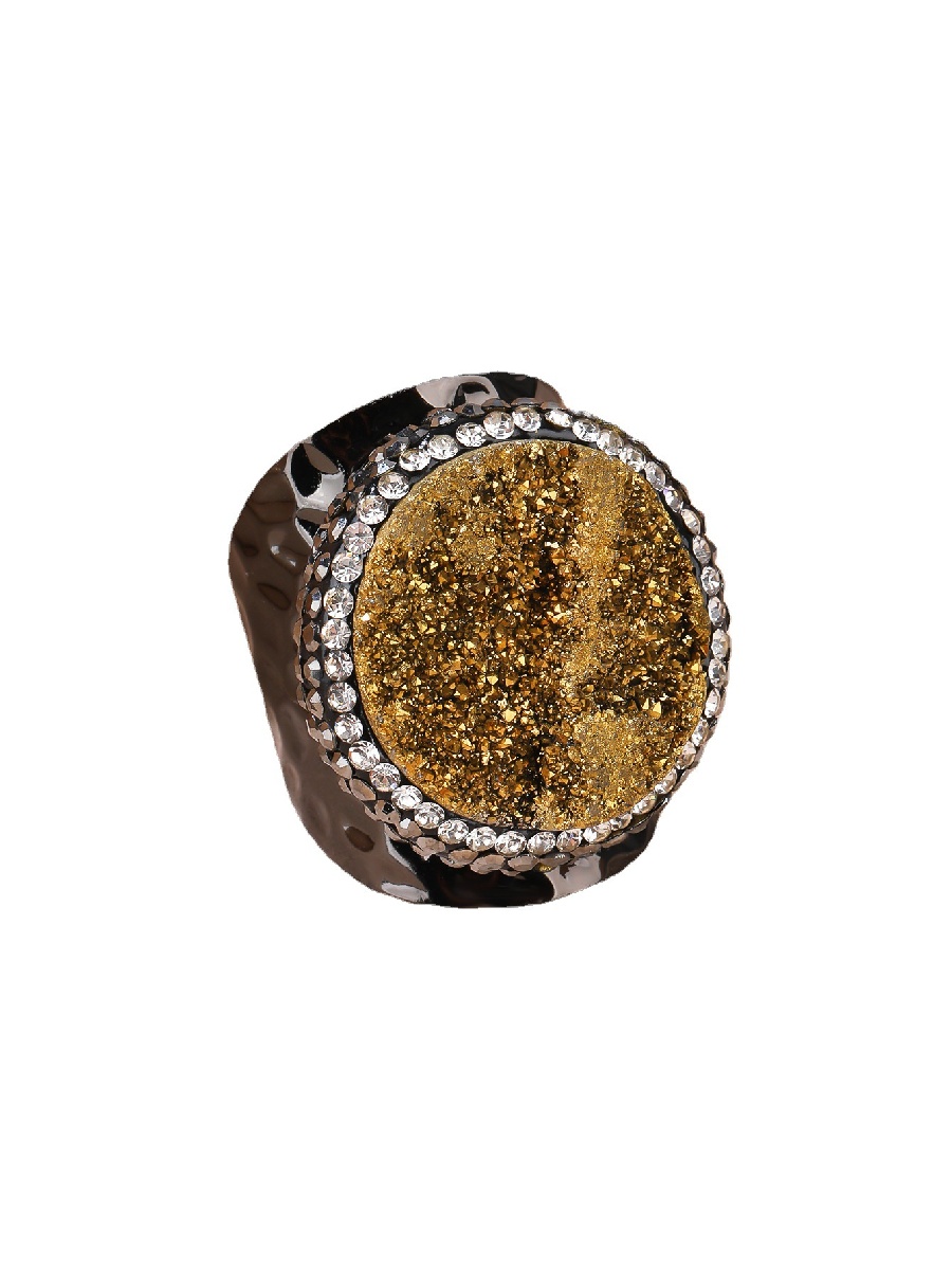 Gold agate druzy ring with sparkling rhinestone halo and a glossy adjustable black band. A powerful statement ring for confidence and abundance.
