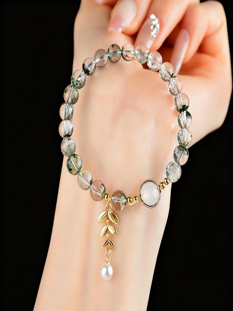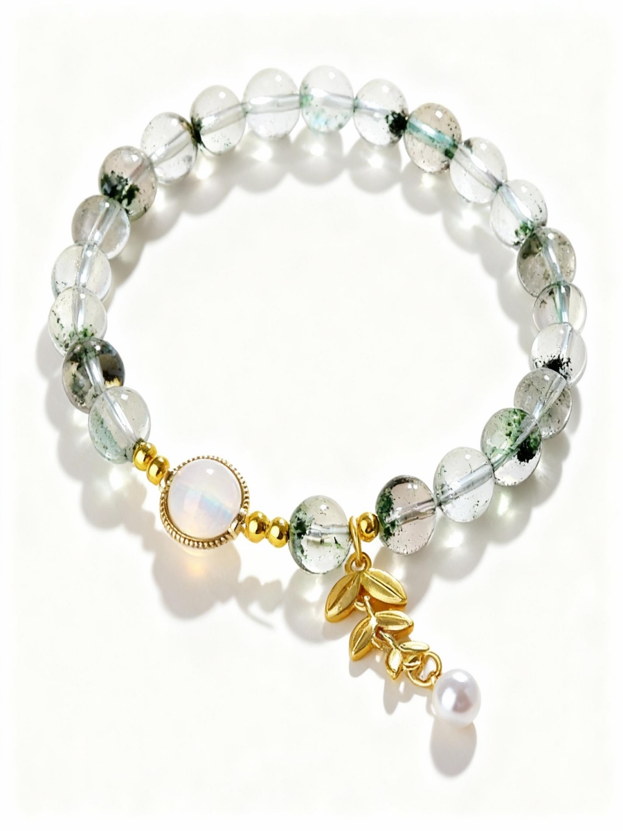 Green Phantom Quartz enhances prosperity and emotional balance, while the golden wheat charm represents harvest and progress.