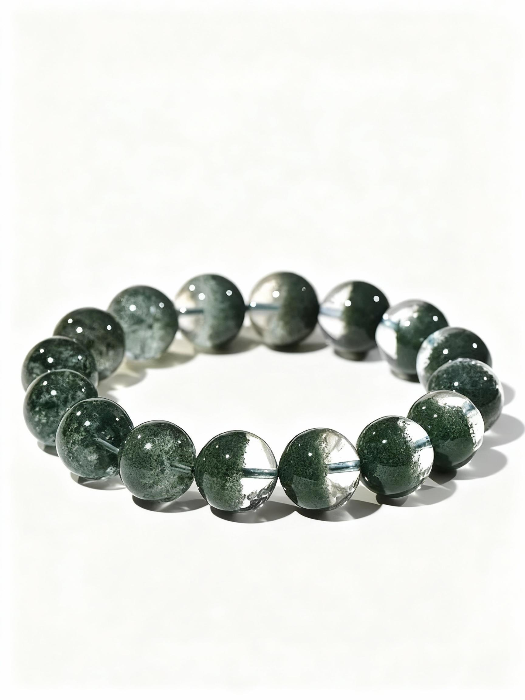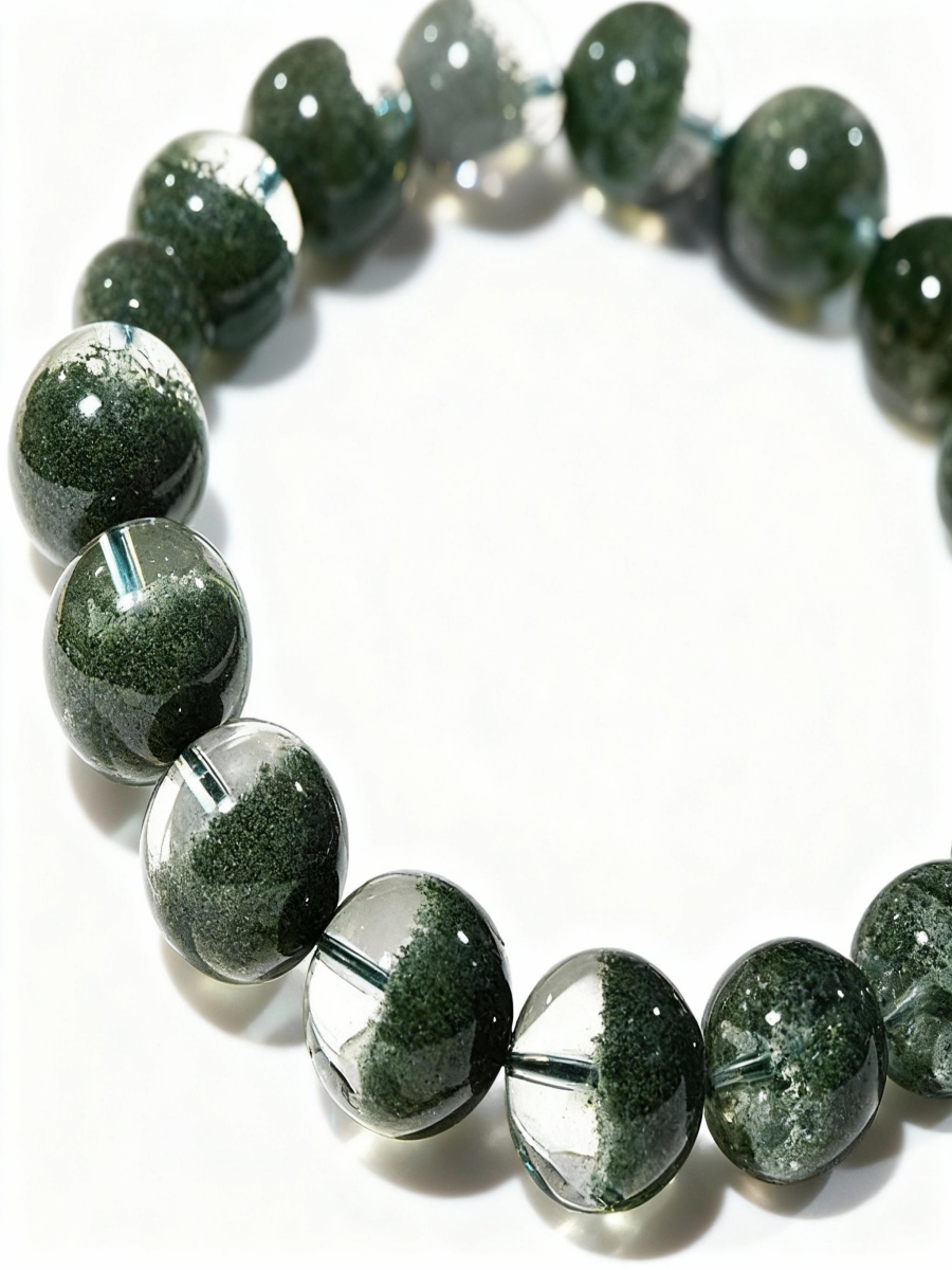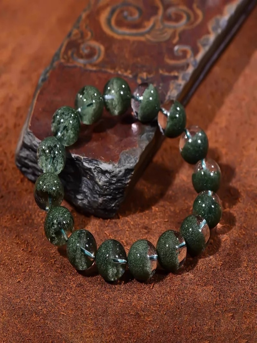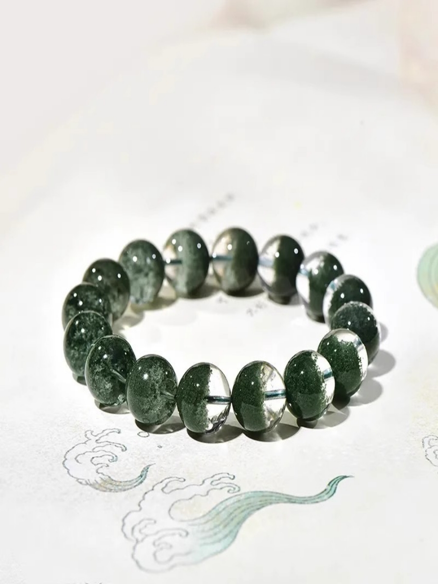 Invite prosperity and growth with the ArvnDao Green Phantom Quartz Bracelet, also known as the “Wealth Bowl Stone.”