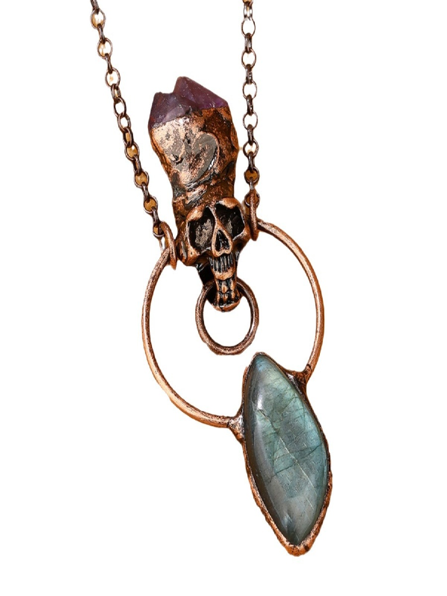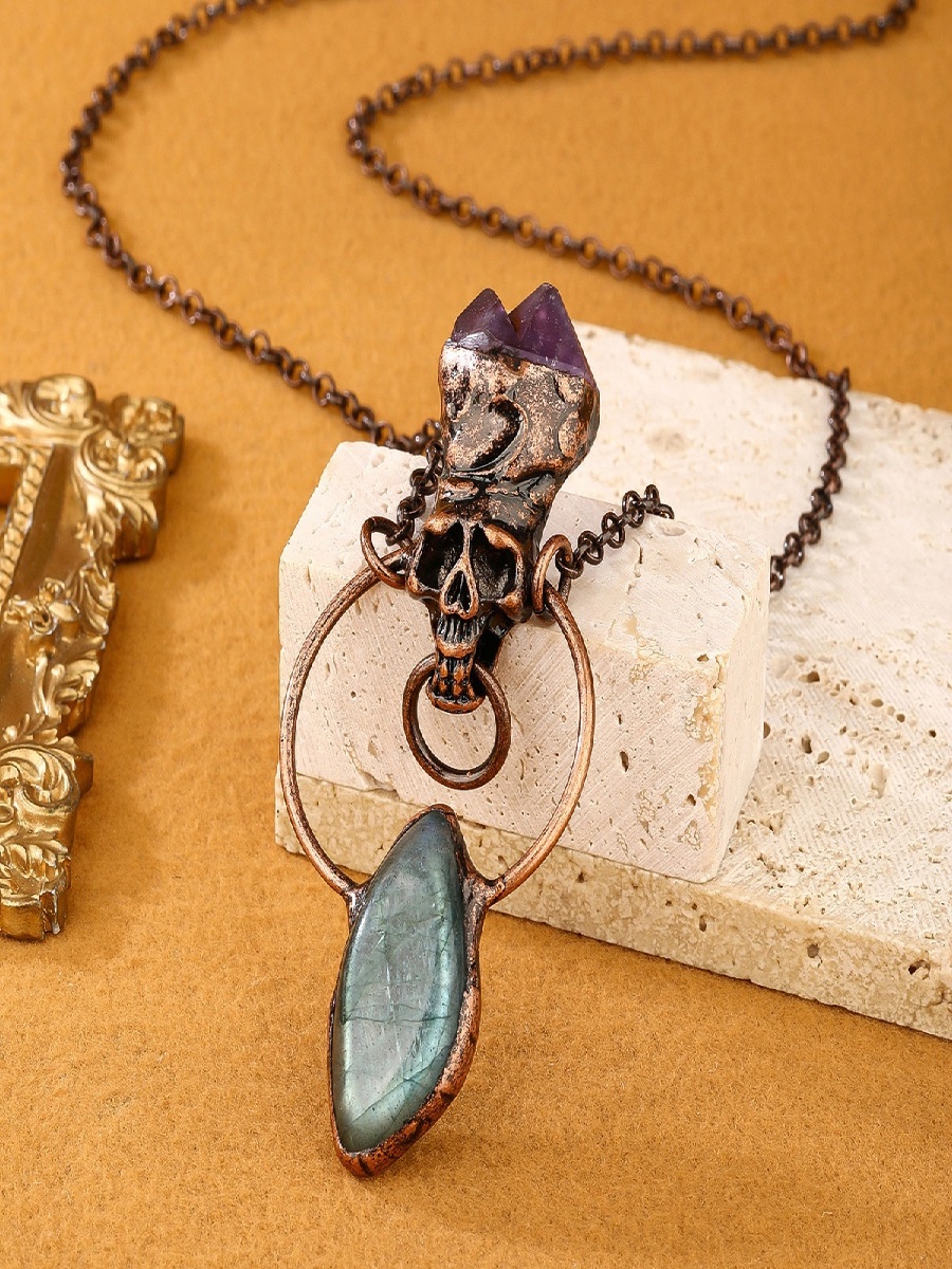 Set in a hand-crafted vintage copper skull frame, this pendant merges mystical energy with bold artisan style. The rugged amethyst cluster on top and the polished labradorite drop below form a powerful balance between intuition, transformation, and protection.