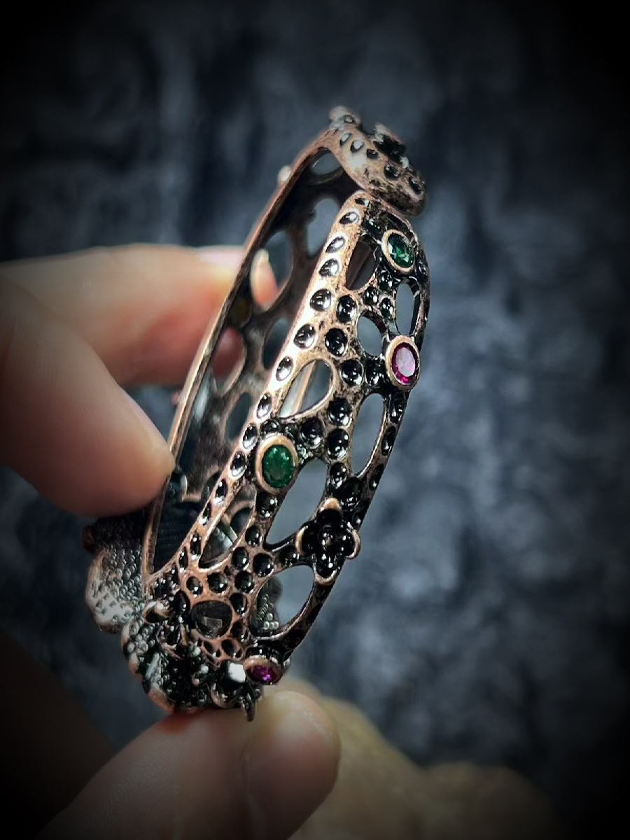 Decorated with small colored accent stones and fine openwork detailing, this bracelet blends artistry with energy work — a wearable talisman of intuition and transformation.
