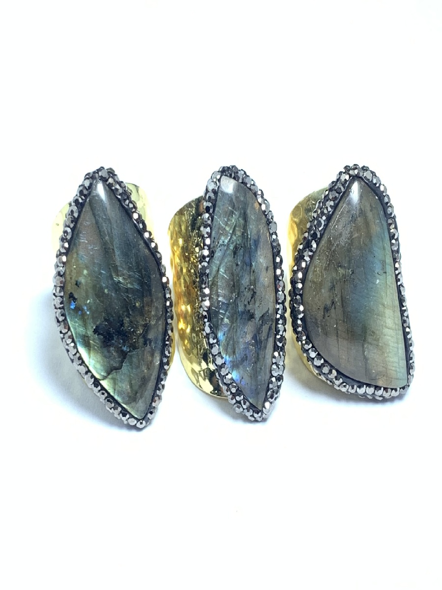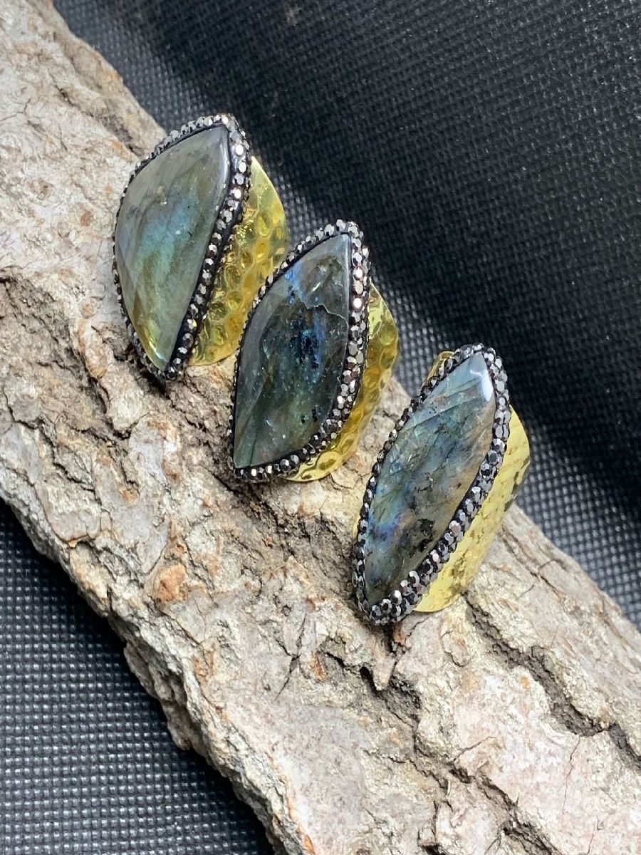 This Labradorite Irregular Adjustable Ring features a polished, free-form labradorite gemstone set on a hammered gold-plated adjustable band, framed with sparkling rhinestones for a mystical yet luxurious look.