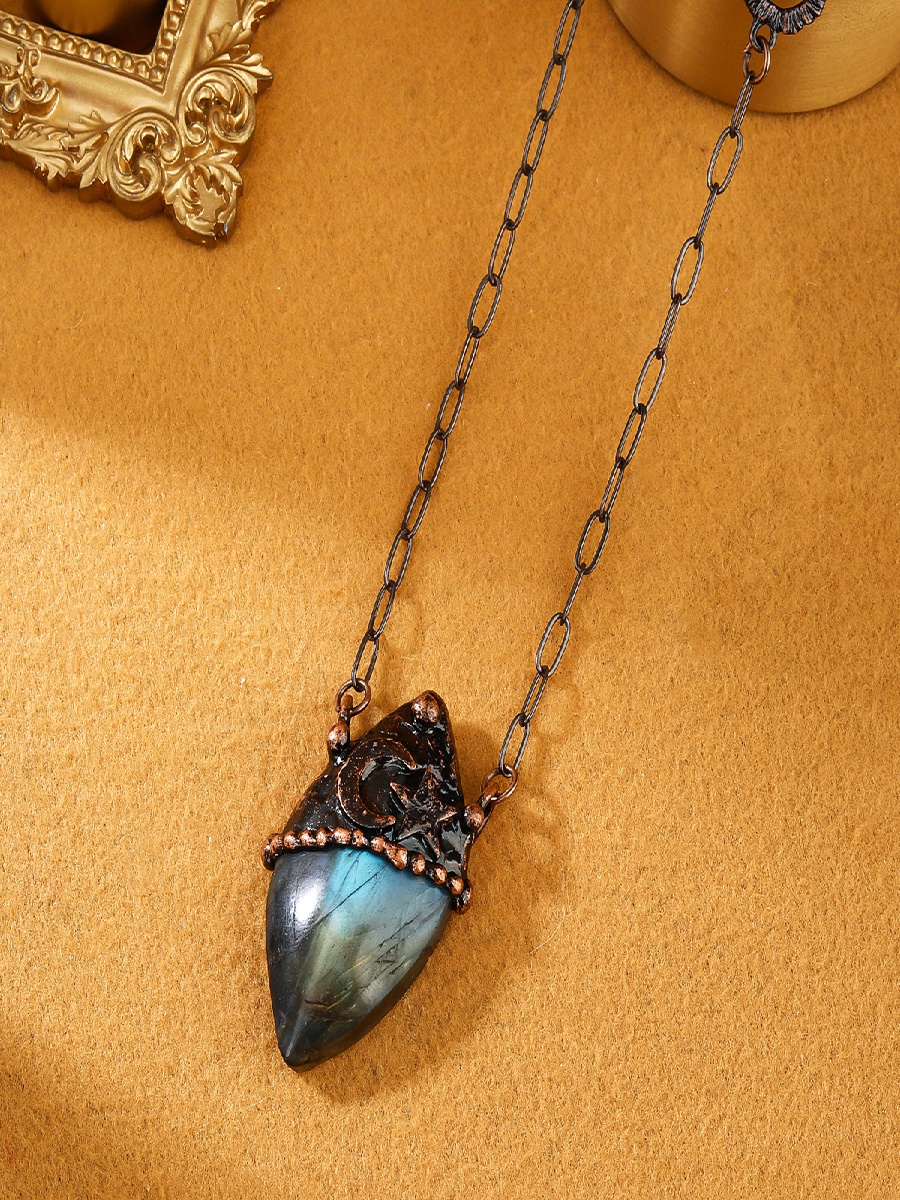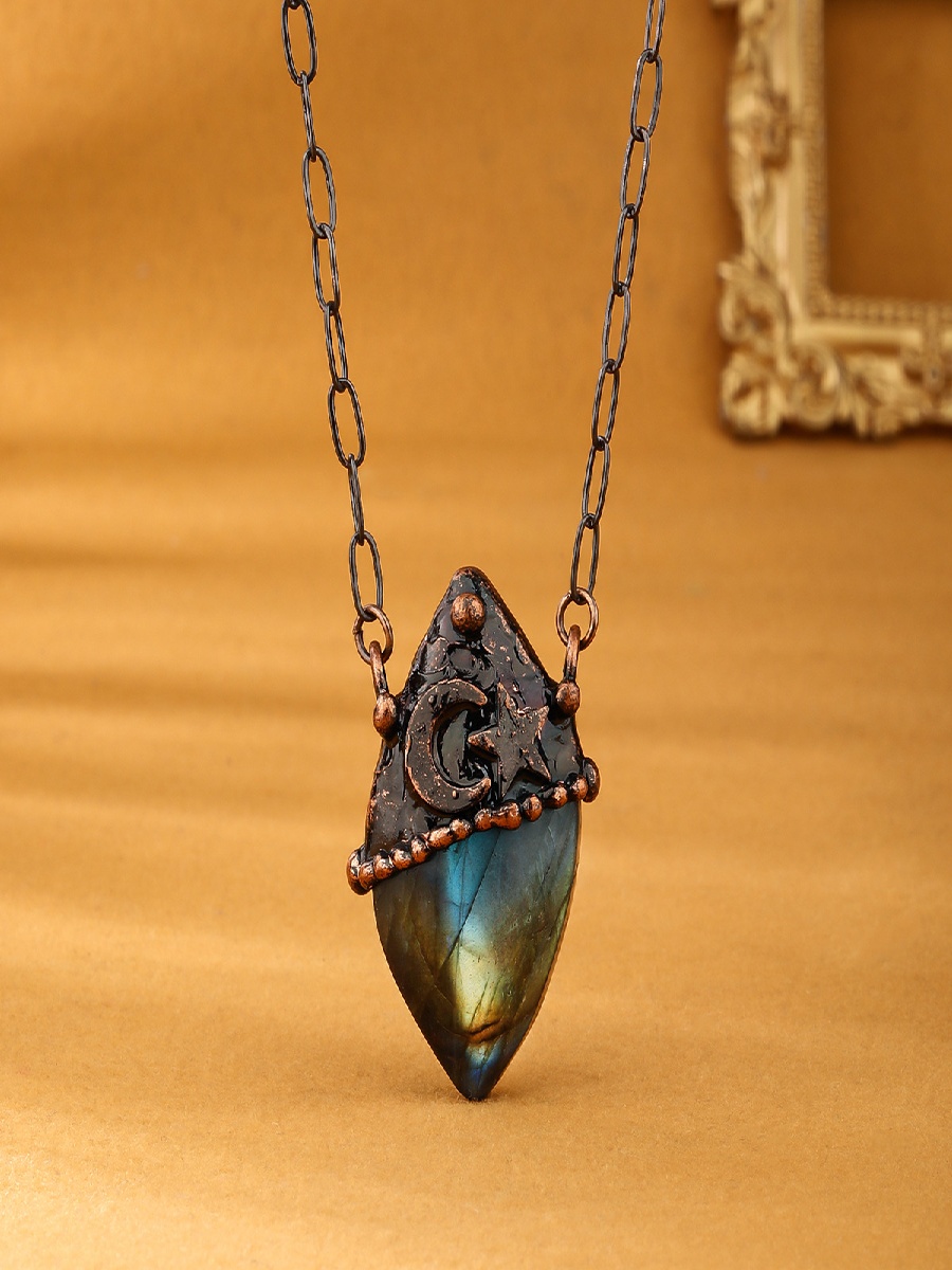 Mystical, protective, and irresistibly enchanting — this ArvnDao Moon & Star Talisman Necklace features a natural Labradorite gemstone wrapped in antique copper with celestial motifs.