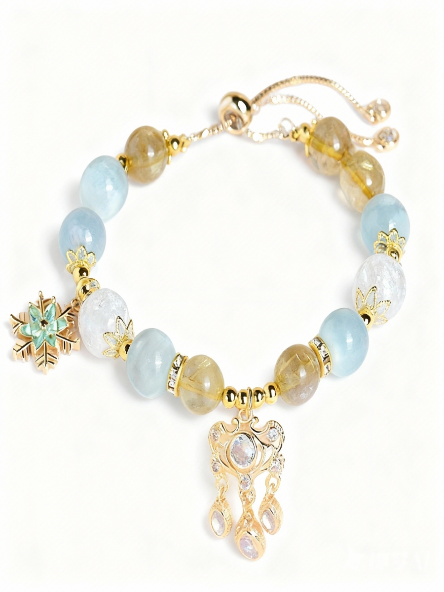 Clear Quartz purifies the aura, Citrine enhances positivity and flow, and Aquamarine supports calm expression and inner harmony. Accented with gold-toned zodiac elements, this bracelet brings both beauty and alignment.