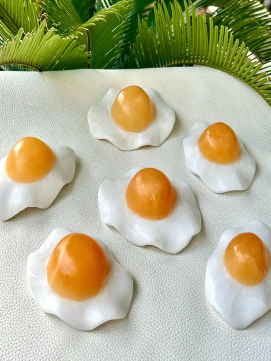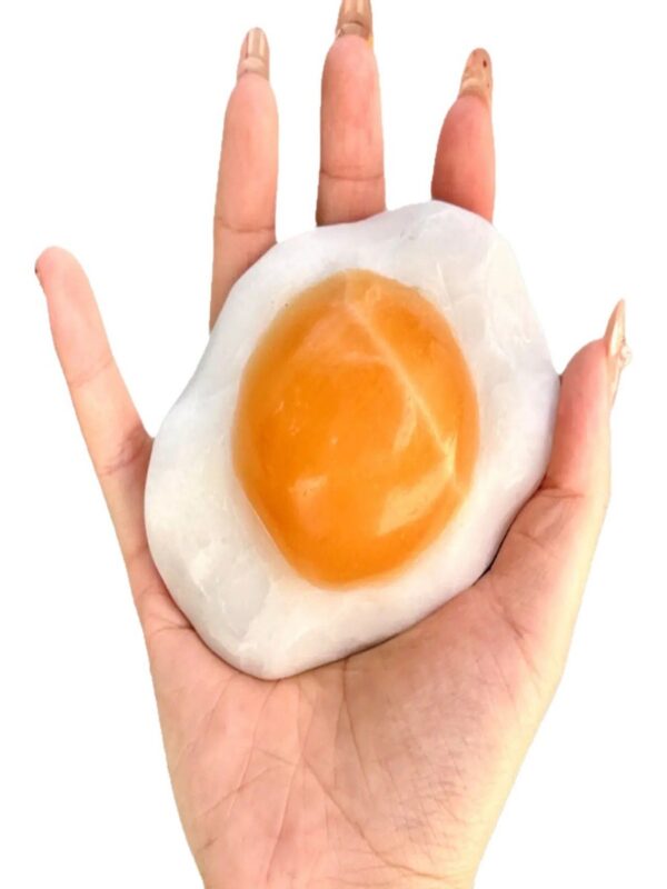 Be the first to review “Natural Calcite Fried Egg Crystal Carving – Hand-Carved Yellow Calcite Egg Yolk & White Quartz “Sunny-Side-Up” Stone”
