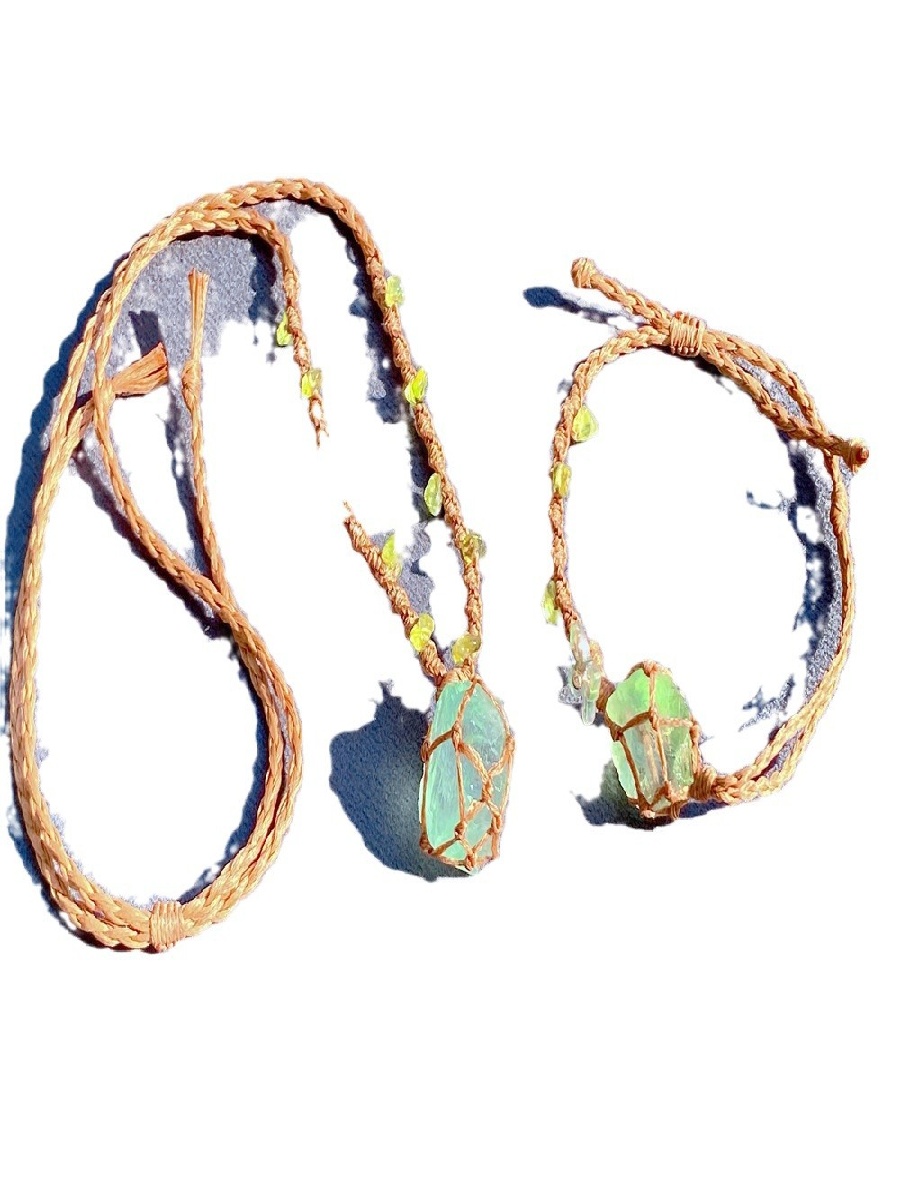The raw fluorite is wrapped in a handwoven macrame net, giving the piece a rustic, organic, and artisanal feel. The adjustable necklace and bracelet are decorated with small peridot chip beads, adding a touch of earth-toned sparkle.