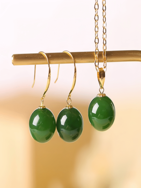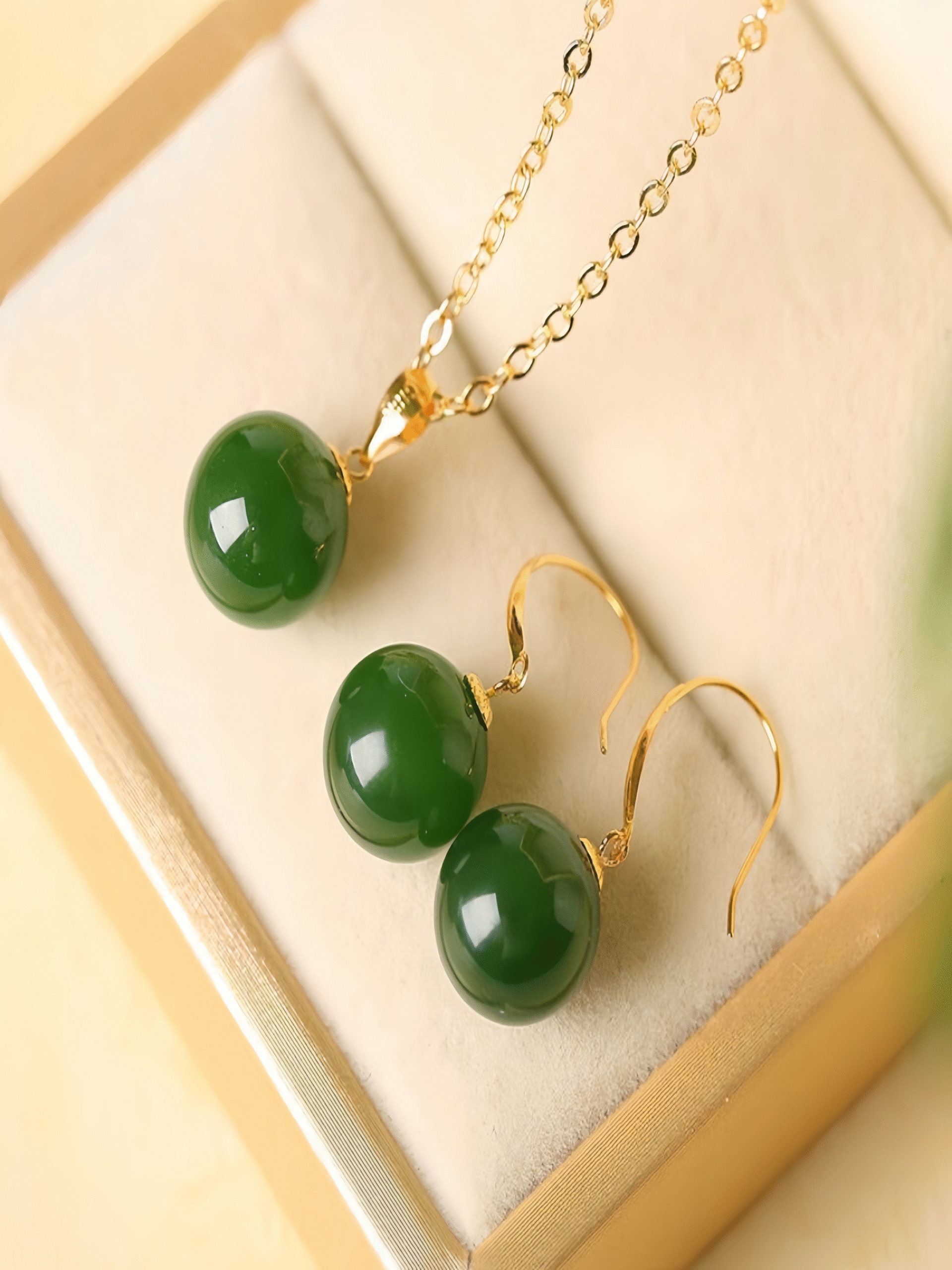 Experience timeless elegance with the ArvnDao Natural Green Jade Jewelry Set, featuring a pair of 9.5mm round jade earrings and a matching pendant necklace. Polished to a high luster, each bead showcases the vivid deep green beauty of genuine jade — a symbol of harmony, prosperity, and protection.