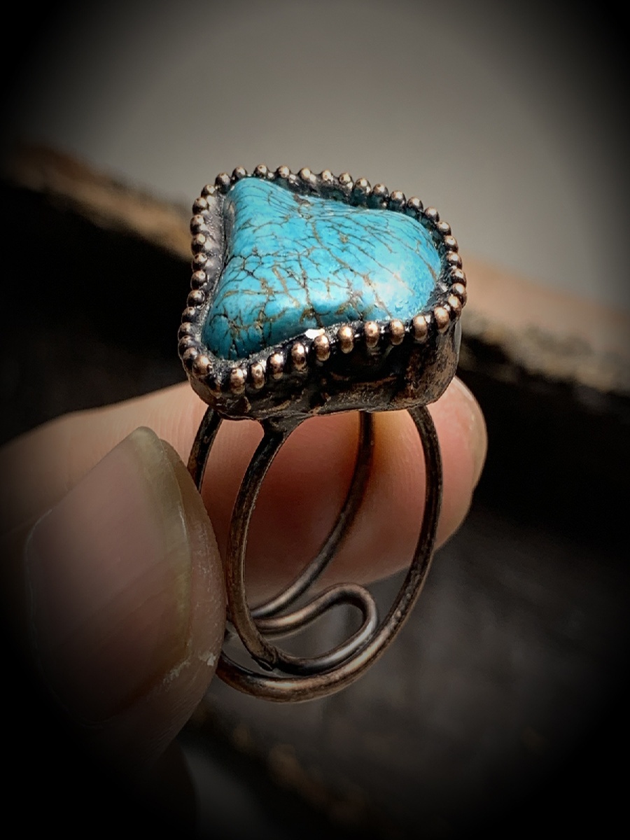 The irregular organic shape honors the stone’s natural beauty, while the antique copper-beaded frame gives the piece a unique artisanal character.