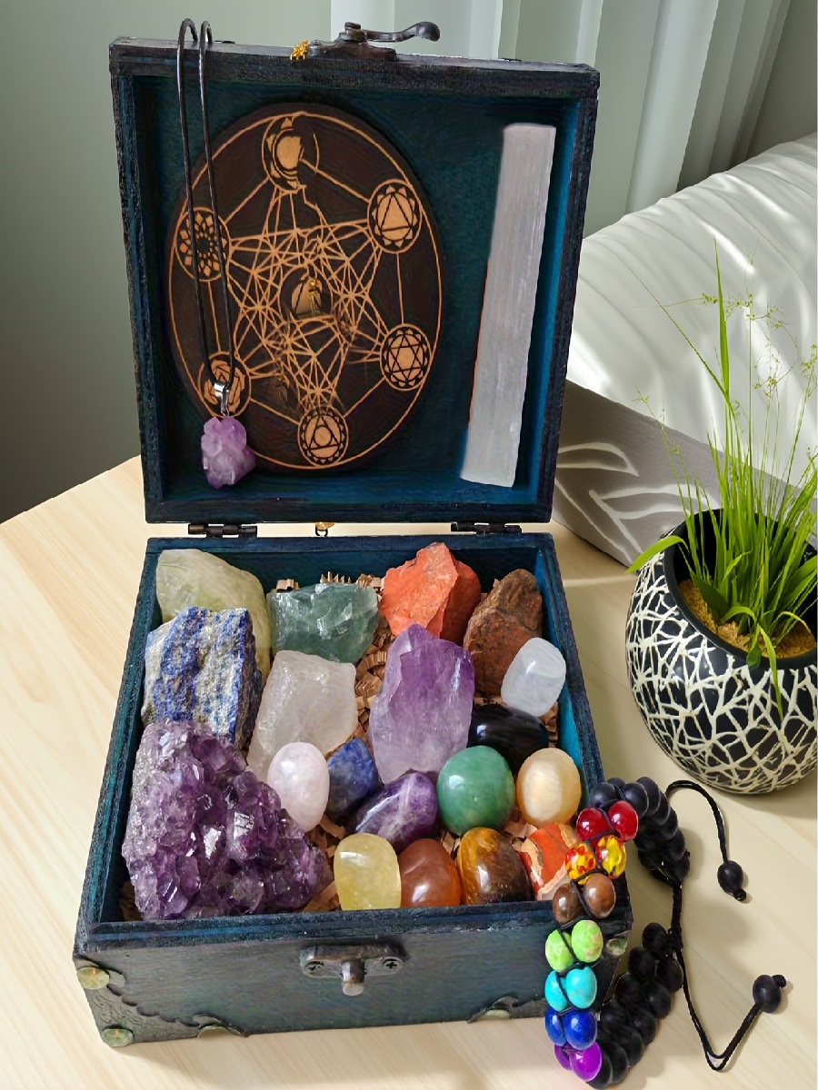 This luxurious set includes raw gemstones, selenite cleansing wand, amethyst cluster, crystal bracelet, and a sacred geometry grid board, creating a powerful healing system for your home, altar, or meditation practice.