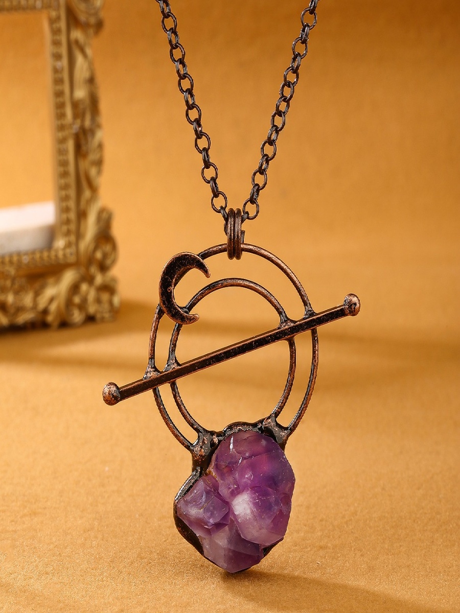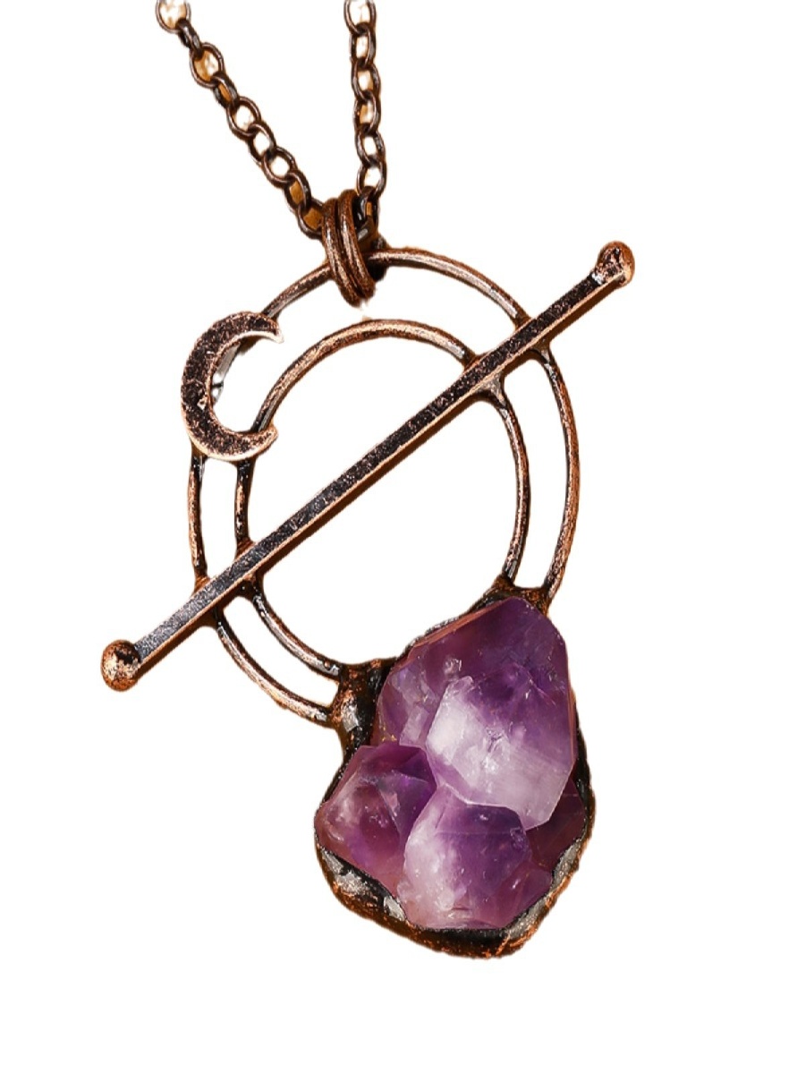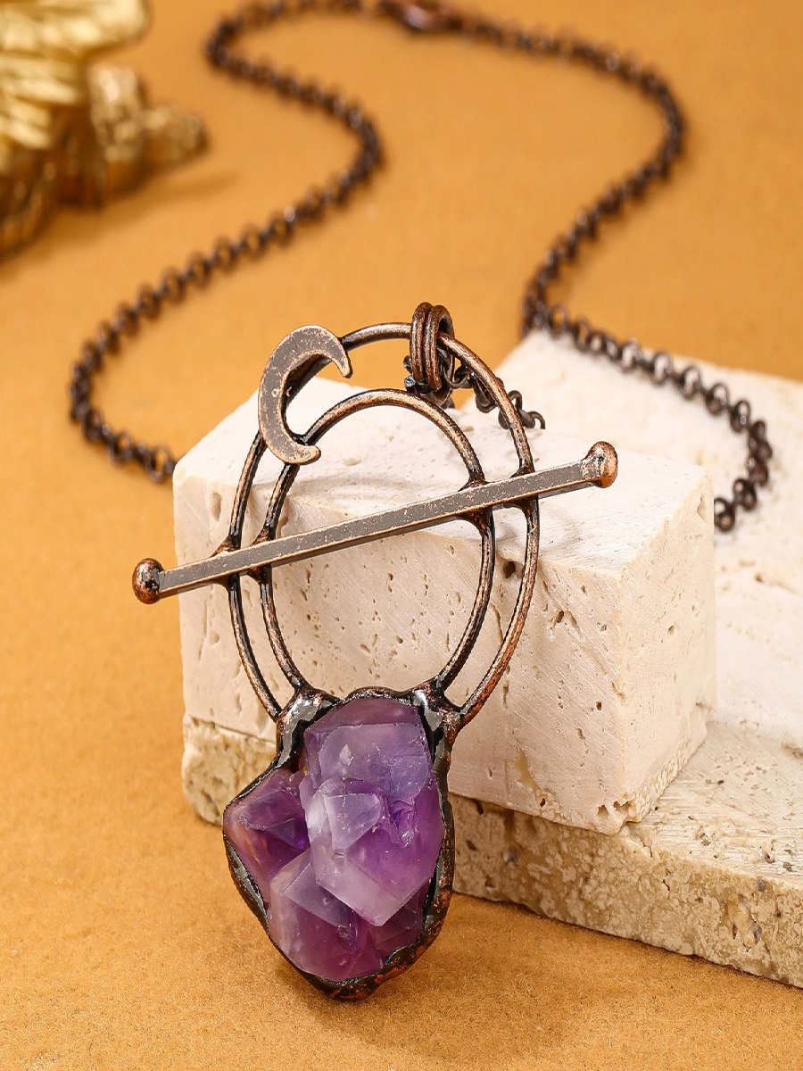 This handcrafted Raw Amethyst Cluster Moon Pendant Necklace blends raw natural beauty with symbolic celestial geometry.