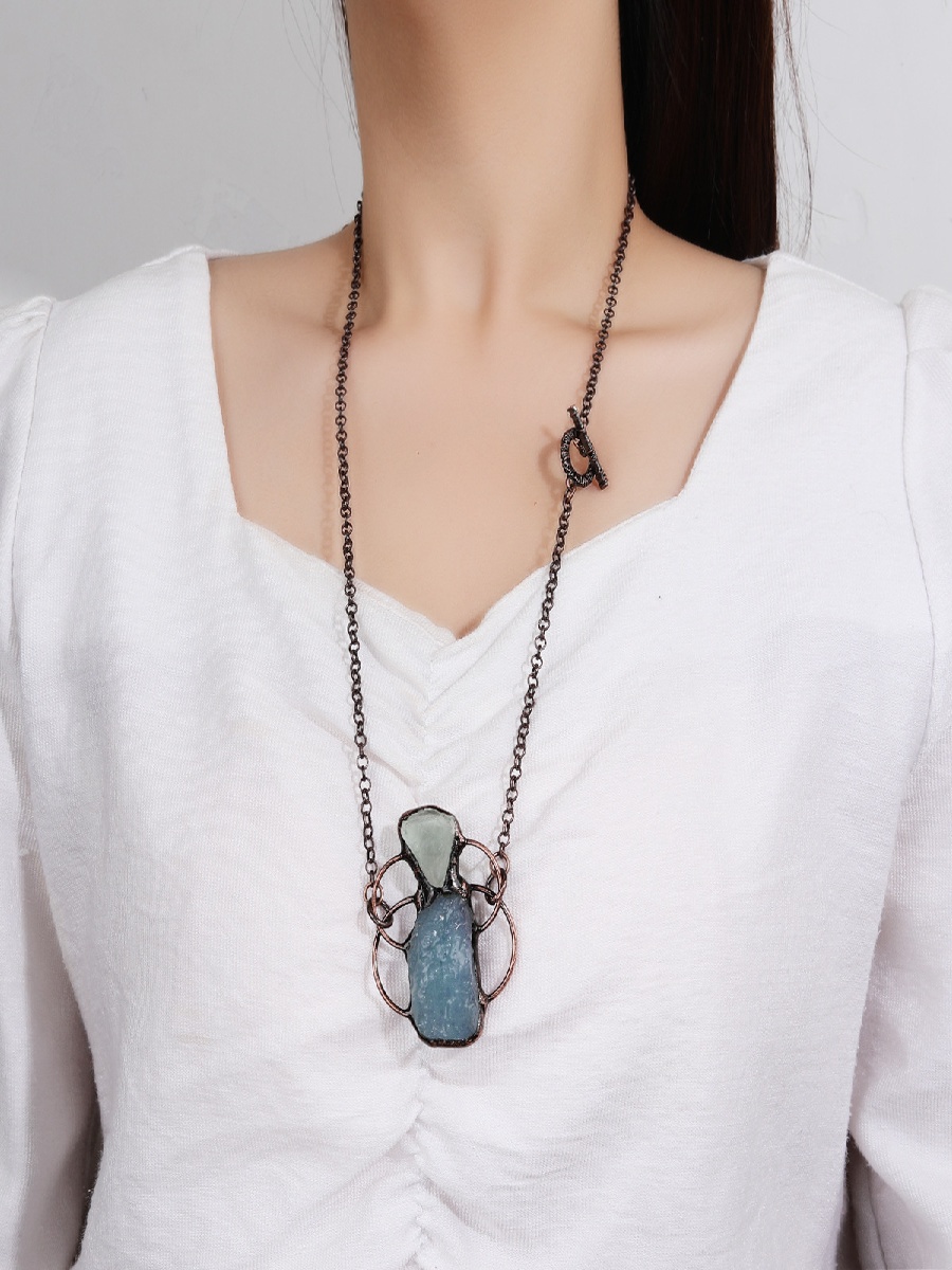 The open geometric loops create balance and movement, making this necklace a statement piece for those who love unique, raw gemstone jewelry.