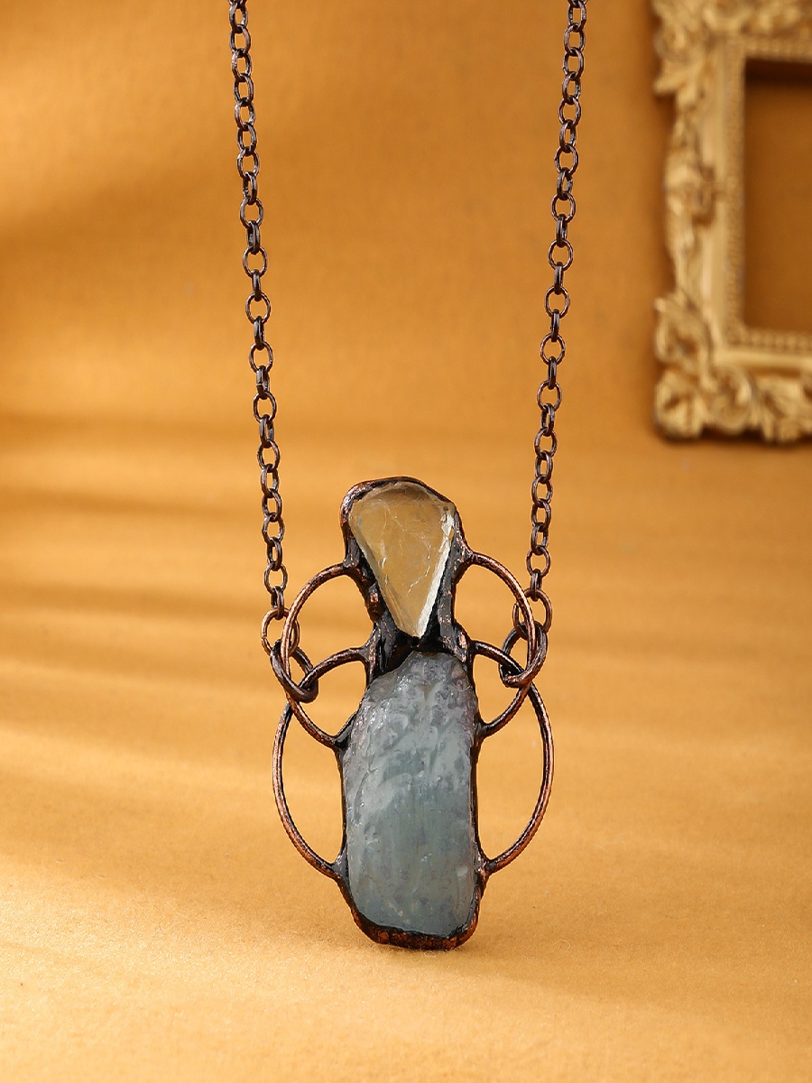 This artisan-crafted pendant features a natural raw aquamarine stone paired with a green fluorite crystal, set in an intricate geometric frame of antique copper. Each piece is electroformed by hand, preserving the organic texture and shape of the stones while adding a mystical, sculptural quality.