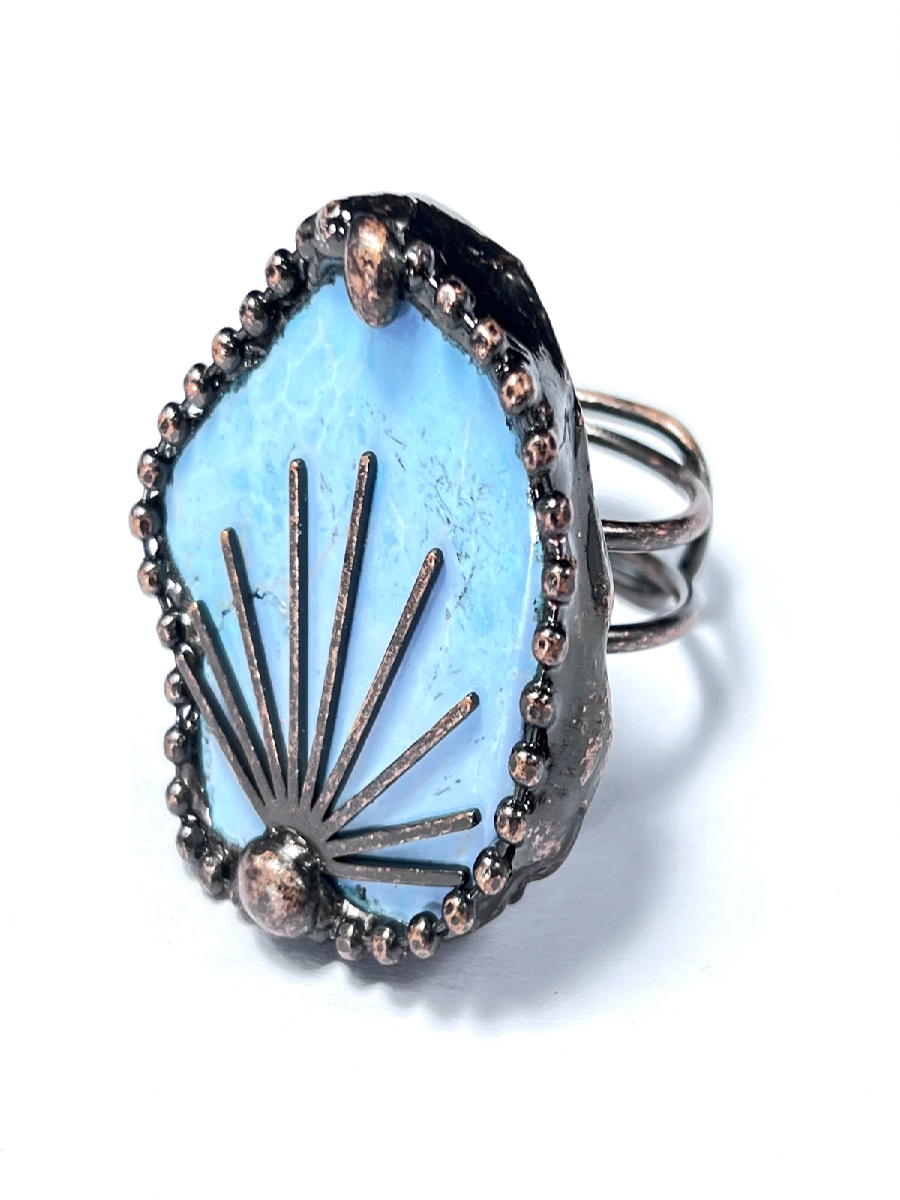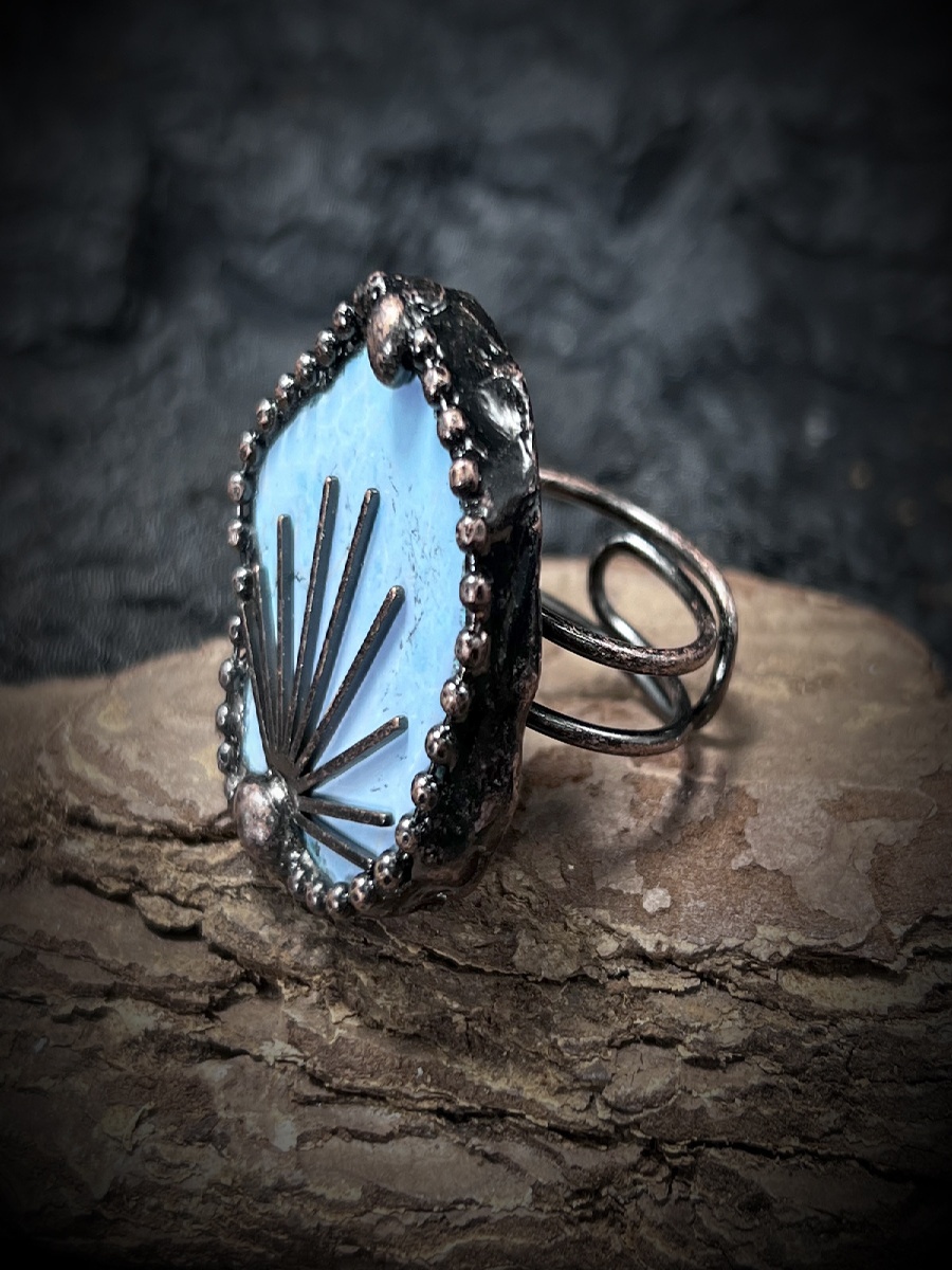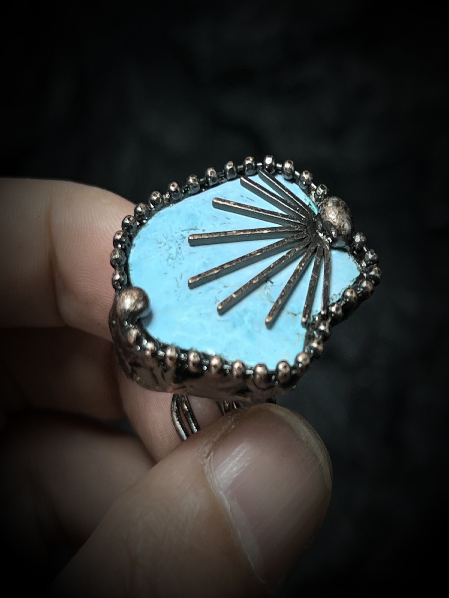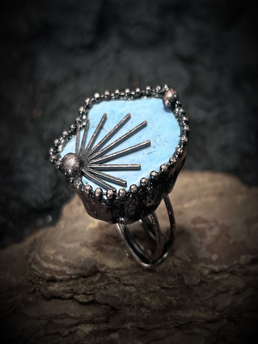 Raw turquoise open adjustable ring with antique bronze sun-burst detailing. A protective and calming stone for clarity and communication.