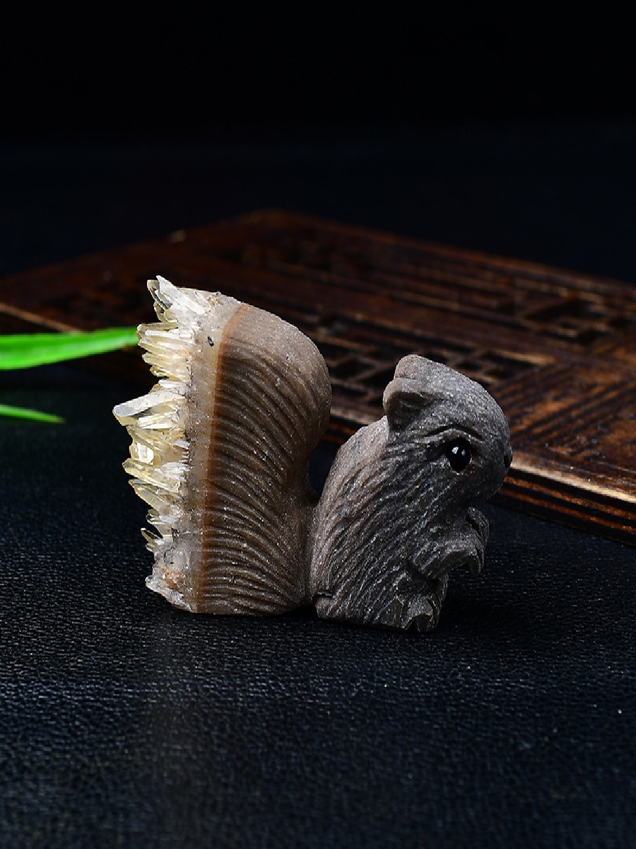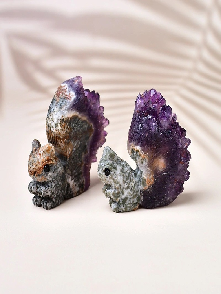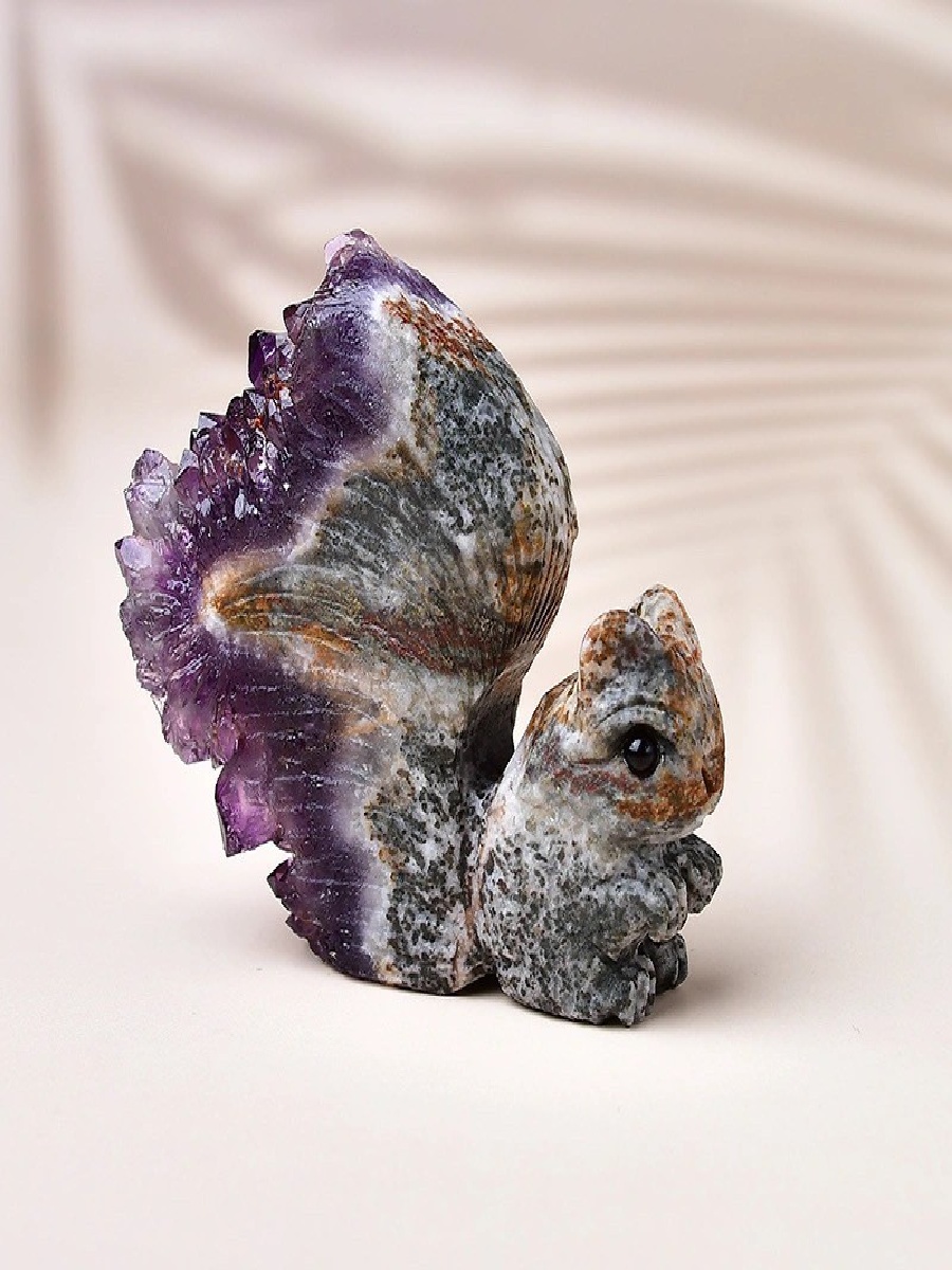 Bring whimsical charm and natural healing energy into your space with this hand-carved Uruguayan Amethyst Cluster Squirrel.