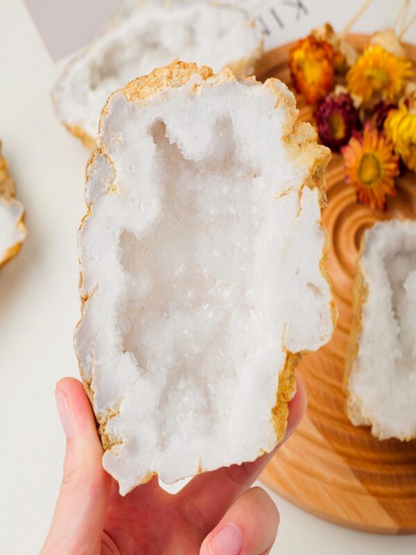 Bring purity, clarity, and peaceful energy into your space with the ArvnDao Natural White Quartz Agate Geode Slice.