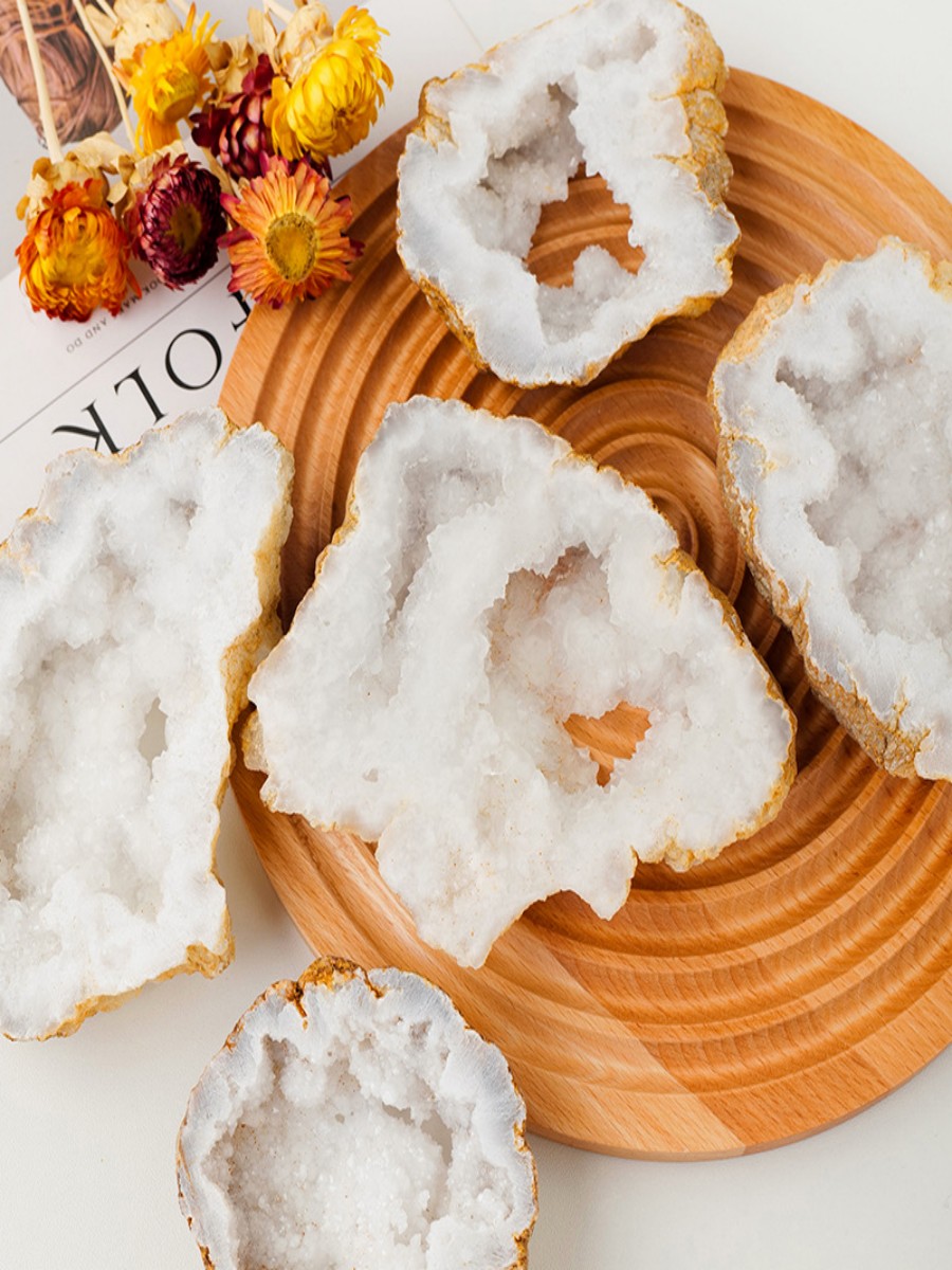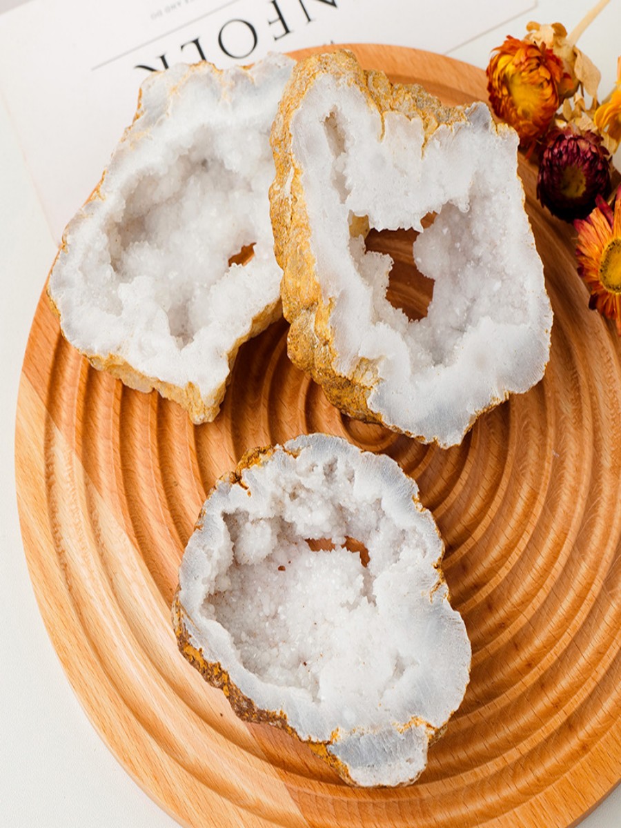 Each piece is a naturally formed geode featuring sparkling crystal clusters encased in an elegant agate shell — perfect for home décor, meditation spaces, and cleansing other crystals.